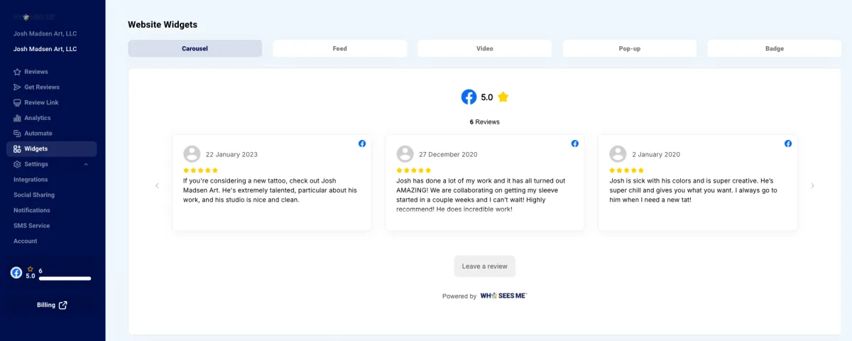 Once a Platform is Integrated, it will stack the reviews into the WhoSeesMe Widget that you can embed anywhere like on your Landing page or on your Website