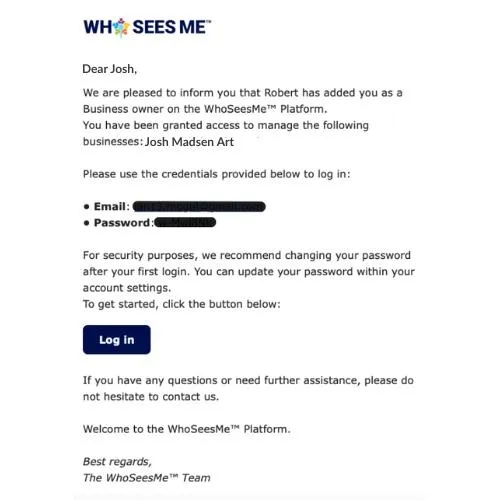 Once Signed up, check your email for the Invitation to WhoSeesMe app. There you will receive your Login Credentials