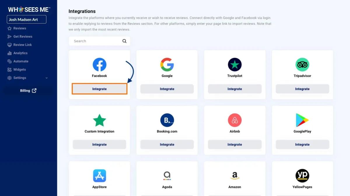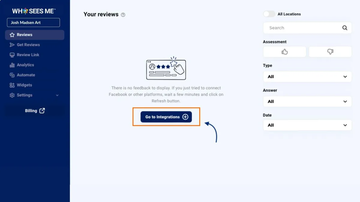 Once Logged in, you will see the Dashboard where you can start Integrating the Review Platform you want to gather and manage