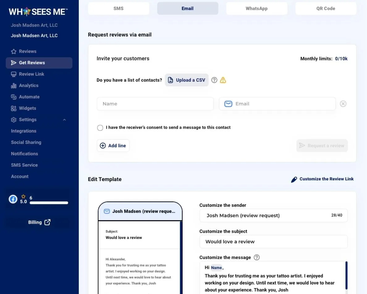 WhoSeesMe is an all-in-one white-label review management designed for local businesses and agencies. It empowers businesses to manage, request, and showcase reviews across multiple platforms effectively. With WhoSeesMe, you can help small businesses boost their online presence, attract more customers, and generate recurring revenue through subscription-based services.